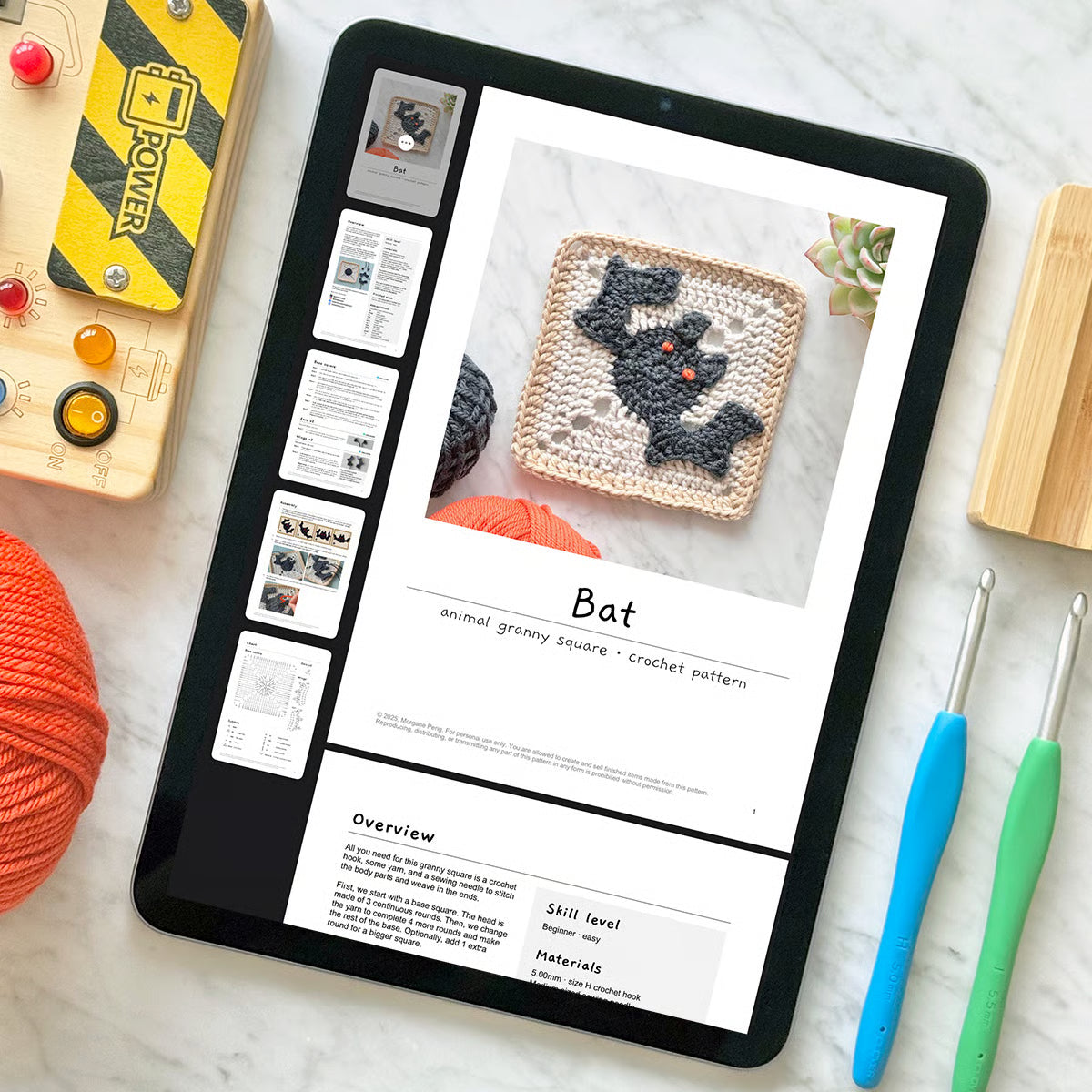 This bat brings just the right mix of spooky and cute to your granny square crochet projects. Perfect for cozy blankets, cushions, and baby sensory items.